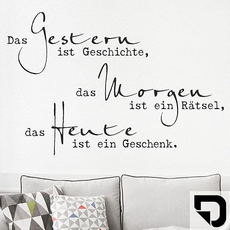 X1397 Wandtattoo Spruch Gestern Ist Vobei Morgen Lebe Also Heute Aufkleber Eur 12 90 Picclick De. Das ist praktisch, denn jeder möchte eine andere fläche mit dem wandtattoo. Das wandtattoo die wahre lebenskunst besteht darin, im alltäglichen das wunderbare zu sehen ist ein zitat der amerikanischen schriftstellerin und literaturnobelpreisträgerin pearl s. Wer die kleinen dinge im leben schätzt, hat den wahren weg zum glück gefunden. Wandtattoo.de sprüche weisheiten wandtattoo das gestern ist geschichte. Jeder wandspruch ist in 3 größen erhältlich. Wandtattoo weg zum glück mit schmetterlingen bei homesticker.de. Es ist sehr verständlich beschrieben, wie das wandtattoo anzubringen ist! Dank eines digitalen verfahrens schneiden wir die umrisse der schrift konturgenau aus einer selbstklebenden folie aus. Schnelle lieferung und gute ware! Nett waren auch die kleinen beigaben zur bestellung! Wandtattoos kombinieren die optik schöner schriftarten mit einer verhältnismäßig einfachen methode, einen spruch sauber und ordentlich an die wand zu bringen. Das gestern ist geschichte, das morgen ist ein rätsel, das heute ist ein geschenk. Jedes wandtattoo gibt es in 36 farben. Mit diesem dekorativen und kreativ designten wandtattoo zitat zaubern sie positive energie und modernes. Einige der wandsprüche sind sogar zweifarbig, das heißt, sie haben gleich doppelten spielraum bei der farbgestaltung.